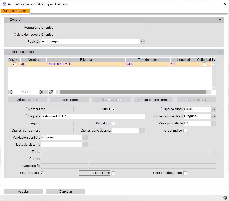 En primer lugar hay que acceder al Asistente de creación de campos de usuario. Desde el propio mantenimiento de clientes, en el formulario de detalle, seleccione el punto del menú Acciones / Añadir campos al formulario. Una vez en el asistente añada el campo vip.