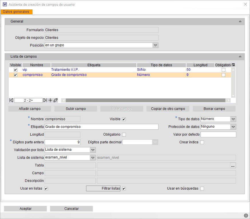 En segundo lugar, desde el propio Asistente de creación de campos de usuario se crea un nuevo campo compromiso.