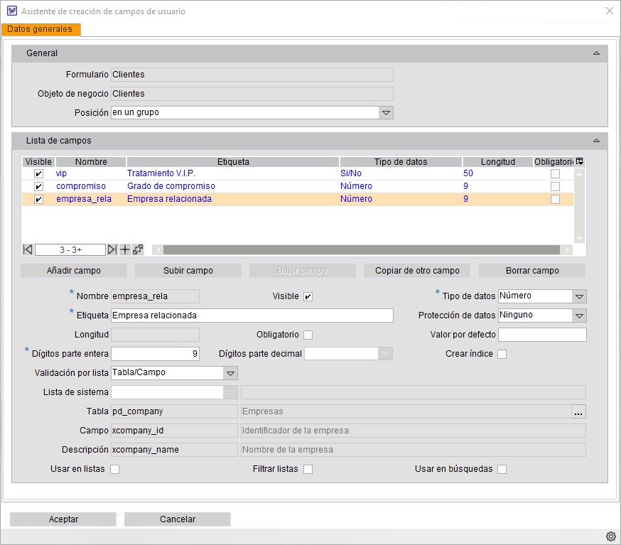 En tercer lugar, desde el propio Asistente de creación de campos de usuario se crea un nuevo campo empresa_relacionada.